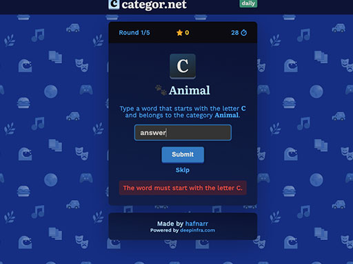 Categor.net is a fun and addictive daily word-guessing game that challenges your vocabulary and quick thinking. Every day you’re given a new word to discover — guess the correct word by using clues and letters before your attempts run out. Simple to learn but surprisingly clever, it keeps your brain sharp and gives you a fresh challenge every time you play.